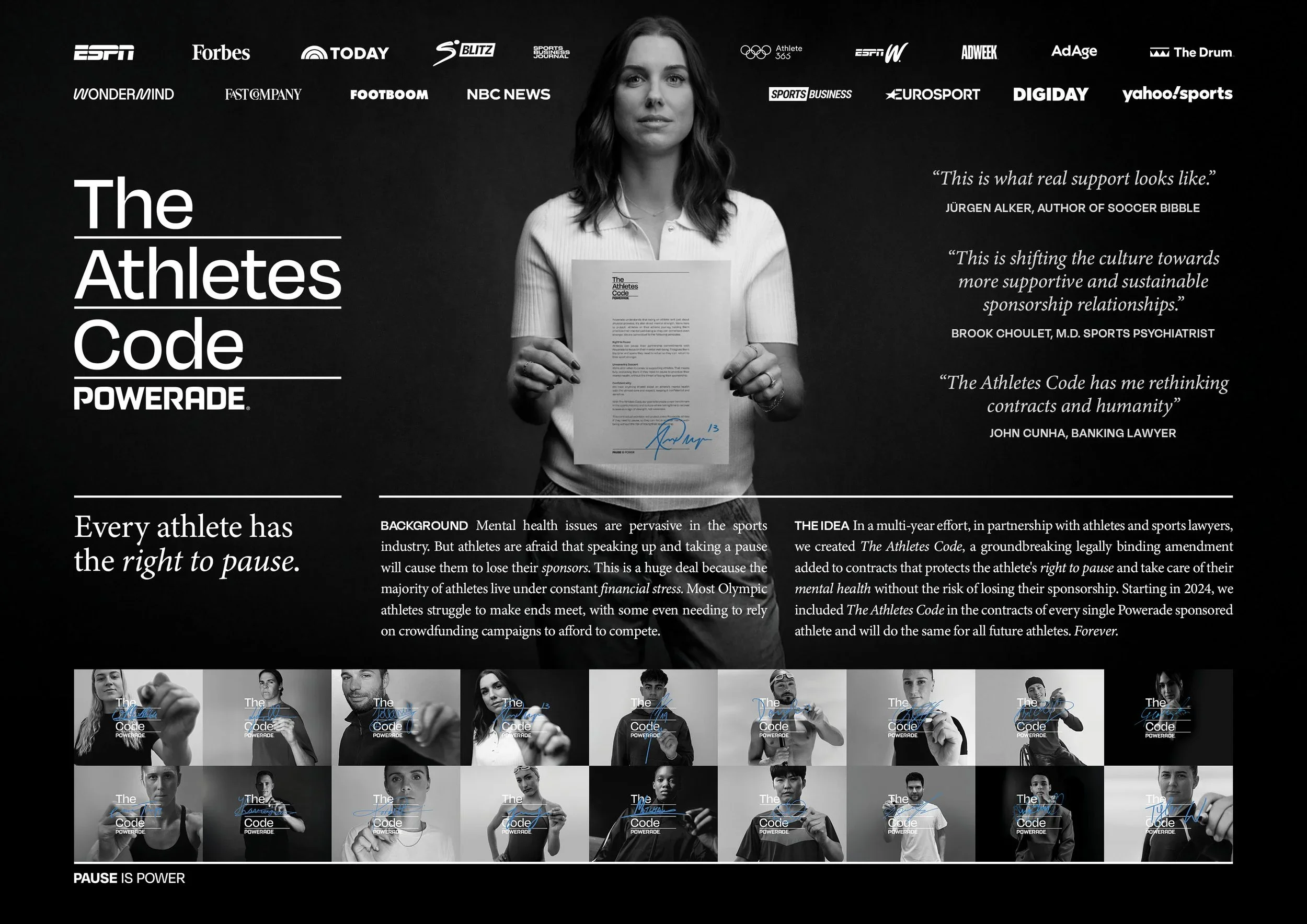 Athlete Code changed the rules of sports sponsorship by putting athlete wellbeing first. Instead of expecting constant performance, Powerade introduced a contract clause that allows athletes to pause sponsorship commitments to focus on their mental health without penalty.