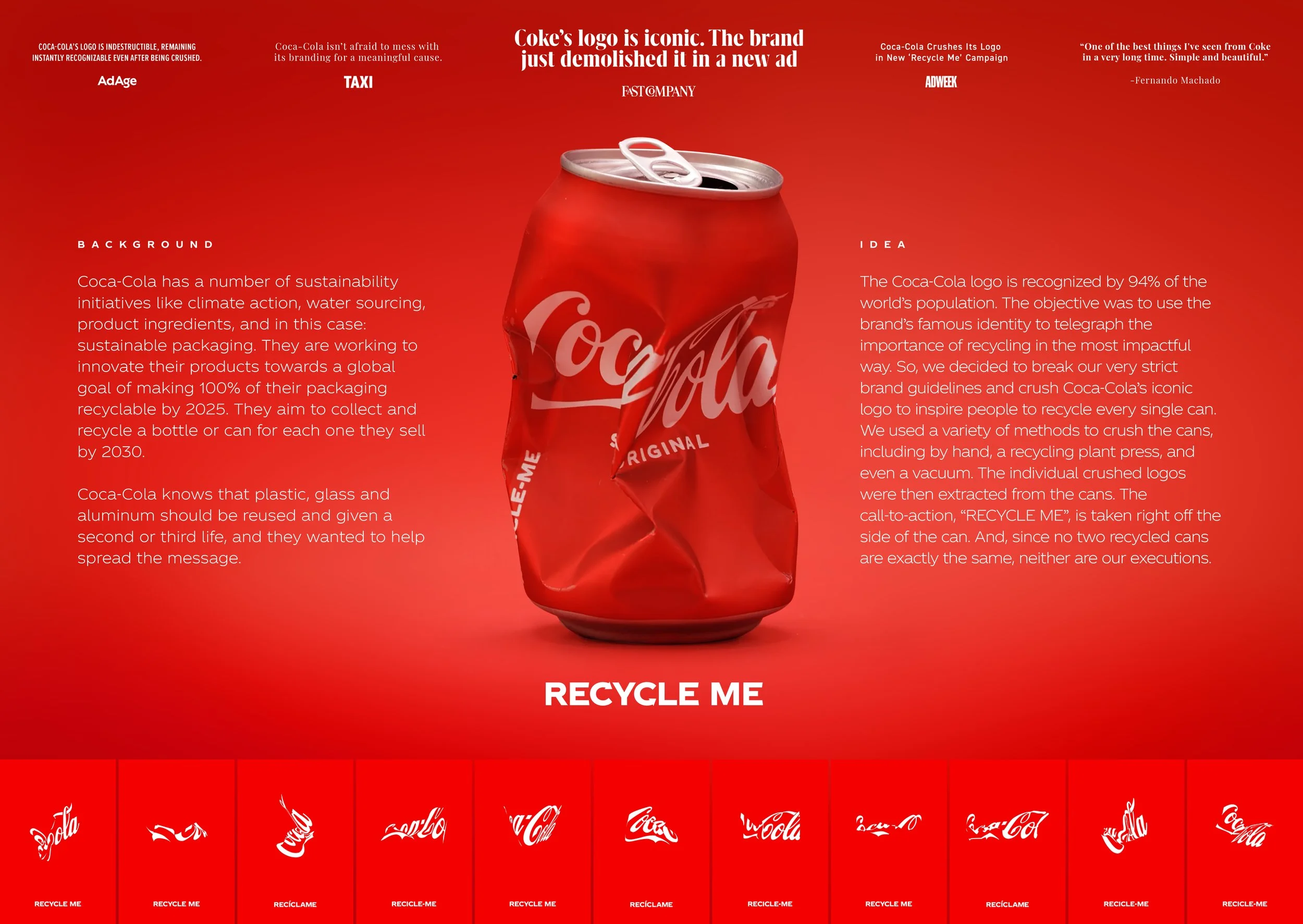 Recycle Me took one of the world’s most iconic logos and turned it into a call to action. By physically crushing the Coca Cola logo, just like a can before recycling, the work transformed a familiar sustainability message into something visual and immediate.
